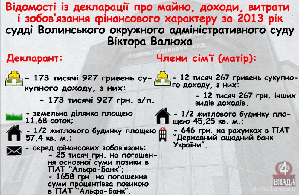 Інший служитель Феміди Віктор Валюх задекларував 173 тисячі 927 гривень доходу за минулий рік. Він володіє земельною ділянкою та половиною будинку.