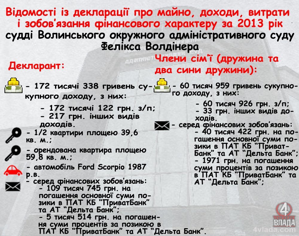 Дещо менше від свого колеги Віктора Валюха заробив суддя Фелікс Волдінер. Його торішній дохід, згідно із декларацією, - 172 тисячі 338 гривень.