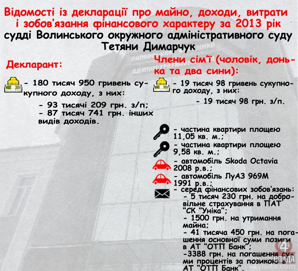 А от суддя Тетяна Димарчук у своїй декларації за 2013 рік не вказала жодного майна. Натомість, вона отримала торік майже 181 тисячу гривень доходу.