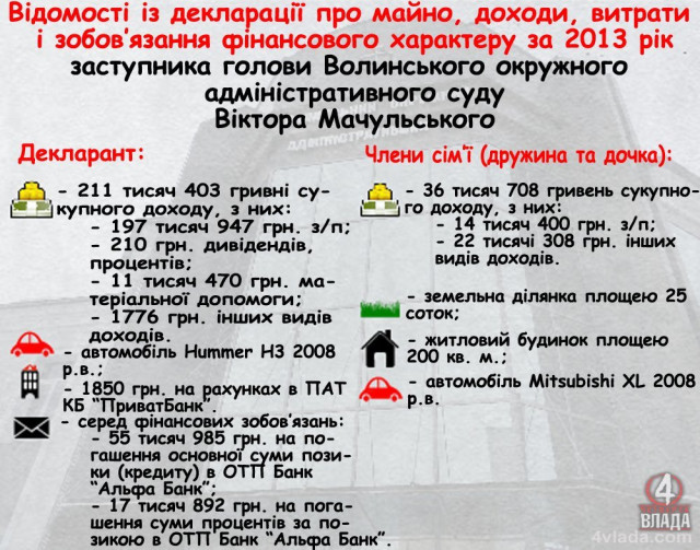 На самого суддю не задекларовано жодної нерухомості. Натомість Віктор Мачульський має одне із найдорожчих серед усіх служителів Феміди цього суду авто – «Hummer H3» 2008 року випуску. Нині таке авто коштує близько півмільйона гривень.