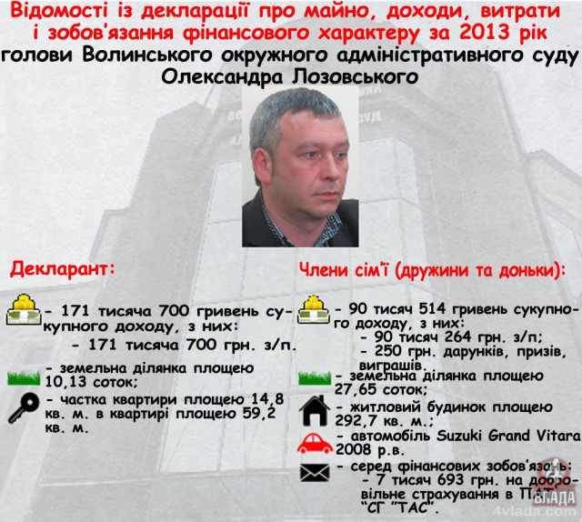 Цікаво, що у декларації за 2012 рік суддя вказав 3 земельні ділянки. Однієї із них (площею 5 соток) уже немає в документі за 2013 рік. Також у 2012 році Олександр Лозовський мав автомобіль «Toyota Camry» 2003 року випуску, а члени його сім’ї – ще й «Daewoo Lanos», яких не значиться в декларації за минулий рік.