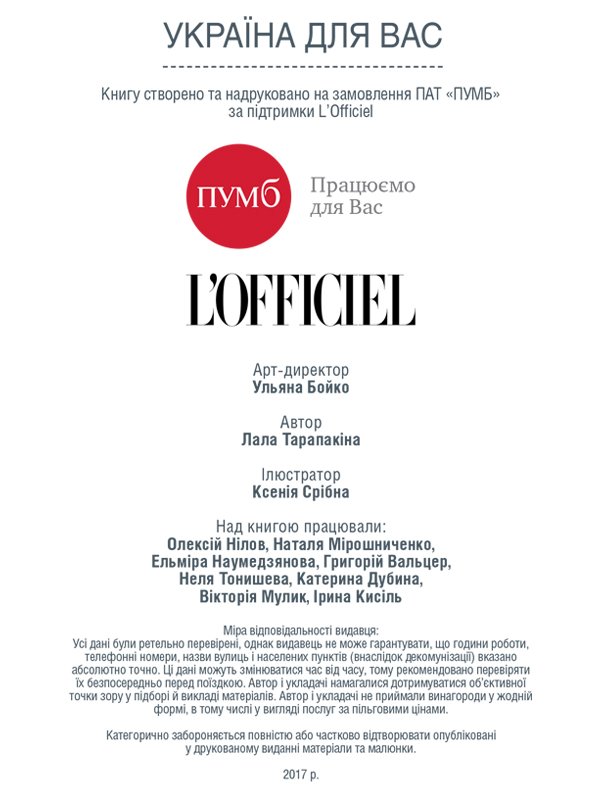 Це місця, про які складно дізнатися в інтернеті. Краще купити книгу. Путівник «Україна для Вас» створили банк ПУМБ і видання L'Officiel. В інтернеті путівник продається тільки на Yakaboo.ua.