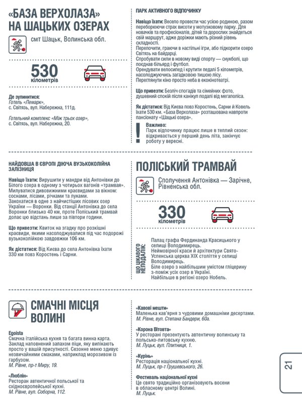 У путівнику «Україна для Вас» 170 туристичних точок, і серед маршрутів немає Львова чи Одеси. Замість цього – Біле озеро з гліцерином для молодості, таємничі болота Міжрічинського парку і найкраща рибалка в Мезинському. Страви древлян на Житомирщині. Ферма з віслюками на Вінничині або кінний двір серед розкішних лугів на березі річки Снов.