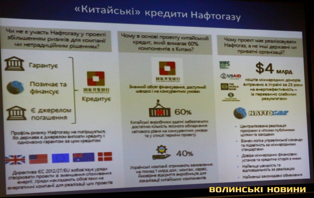 Нещодавно компанія-монополіст НАК «Нафтогаз України» виступила з ініціативою заміни газових котлів. Йдеться про встановлення малозабезпеченим верствам населення нових котлів на заміну старим. Для цього вирішили залучити китайський кредит. Закупівлю обладнання планують здійснювати в пропорції 60 (китайське обладнання) на 40% (українські компанії отримають замовлення на понад мільярд доларів на монтаж, сервіс, ймовірне відкриття виробництв для локалізації китайських компонентів). Зі слів експерта, проект неоднозначний, адже передбачає купівлю китайського обладнання.