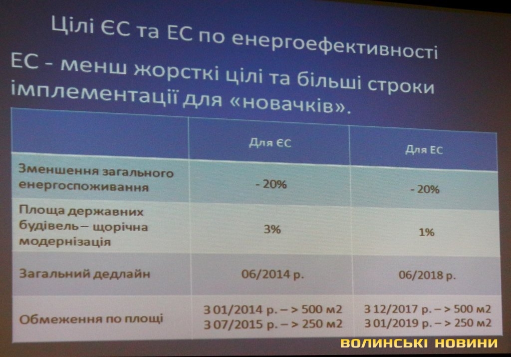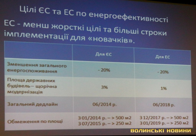 Цілі для ЄС та ЕС є загальними, а різниця між ними полягає в тому, що ЕС має менш жорсткі цілі та більші строки імплементації для «новачків». До прикладу, до 2020 року планують знизити енергоспоживання на 20%, щорічна модернізація державних будівель визначена в обсязі 3% площі для ЄС та 1% для ЕС. Обмеження по площі для цих будівель становить для ЄС – 250 метрів квадратних з липня 2015 року та для ЕС – 500 метрів квадратних з грудня 2017 року, 250 – з січня 2019 року.