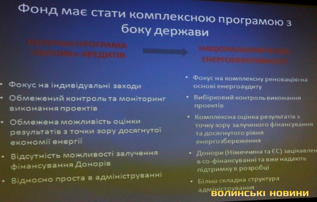 Створення Фонду енергоефективності є виконанням статті 20 директиви ЄС 2012/27 відповідно до зобов’язань Угоди про Асоціацію. У фонді діятиме технічний офіс, який видаватиме кредити (фінансові продукти). Кредити розподілятимуться для тих, хто не отримує субсидій (домогосподарства, які інвестуватимуть в енергоефективність, згодом, через декілька років, зможуть платити меншу суму за комунальні послуги, оскільки споживатимуть менше енергоресурсів). Експерт наголосив, що специфіка проектів енергоефективності з технічної точки зору полягає в тому, що вони розраховані на весь будинок (економія може досягти 70-80%), а «клаптикова модернізація» є навіть шкідливою. Претендувати на проект можуть ОСББ, зібрання мешканців, або керуюча компанія, тобто, умовна юридична особа, яка акумулюватиме кошти мешканців, що вкладатимуться в проект як власна інвестиція і яка розплачуватиметься за кредитом.