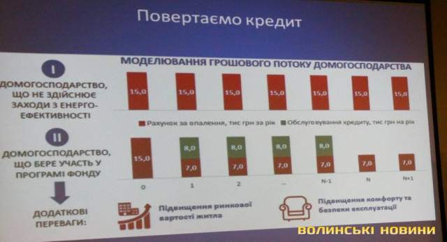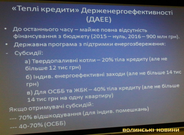 Проблема полягає в тому, що програма погано фінансується. Так, у 2015 році вона не отримала фінансування, у 2016 році на неї спрямували 900 мільйонів гривень. Започаткували роботу з місцевими органами влади, яка полягає в тому, що за кошти місцевих бюджетів позичальнику відшкодовують відсотки за кредитами. Це важливо, адже окрім компенсації тіла кредиту позичальник стикається з банківською системою. Оскільки банк повинен убезпечити себе від ризиків неповернення коштів, він працює за ринковою ставкою. Тобто, кредити надавали зі ставкою від 25% річних у гривнях, що посуває строк окупності проекту на 7-10 років, відповідно, небагато позичальників мотивовані брати цей кредит. Отже, держава домовилася з муніципалітетами щодо відшкодування відсотків з місцевих бюджетів. Після запуску такого проекту, справді, люди почали активніше брати кредити. До прикладу, програма з відшкодування частини відсотків за кредитами на термомодернізацію для ОСББ діє у Луцьку. Обласна програма відшкодування відсоткової ставки у розмірі 25% для фізичних осіб та ОСББ/ЖБК на впровадження енергоефективних заходів передбачає витрати у розімір 450 тисяч гривень з обласного бюджету.