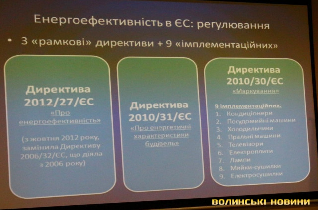 Вступивши в ЕС, Україна зобов’язалася імплементувати три рамкові та дев’ять імплементаційних директив у галузі енергоефективності. Дві директиви – 2012/27/ЄС «Про енергоефективність» та 2010/31/ЄС «Про енергетичні характеристики будівель» визначають політику Євросоюзу щодо енергоефективності. Країни ЄС вирішили об’єднати свої національні політики щодо енергоефективності і досягти визначеної мети зі зменшення споживання енергії. Директива встановлює стандарти для енергоаудиту, послуг енергосервісу – усієї інфраструктури, без якої здійснення енергоефективних заходів неможливе. Директива «Про енергетичні характеристики будівель» доповнює першу і визначає більш специфічні речі, наприклад, зобов’язання зі скорочення енергоспоживання у секторі державних будівель. Це повинно показати преваги інвестицій в енергоефективність для приватного сектора. Окрім цього, відповідно до директиви 2010/30/ЄС «Маркування» Євросоюз визначає стандарти маркування побутових приладів. Дев’ять імплементаційних директив стосуються маркування кондиціонерів, посудомийних машин, холодильників, пральних машин, телевізорів, електроплит, ламп, мийок-сушарок та електросушарок.
