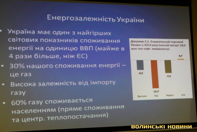Україна має один з найгірших світових показників споживання енергії на одиницю ВВП (майже в 4 рази більше, ніж ЄС), 30% споживання енергії всередині країни припадає на газ. Існує висока залежність від імпорту газу (майже 16 мільярдів доларів витратили на купівлю газу закордоном у 2014 році). Це призводило до відтоку валюти з країни, тиску на гривню тощо. Після того, як почали підвищуватися ціни у 2009 році, промисловість краще адаптувалася до цього, тому що сплачувала ринкову ціну, але там, де був субсидований сегмент, він споживав багато газу. 60% газу споживається населенням (пряме споживання та централізоване теплопостачання).
