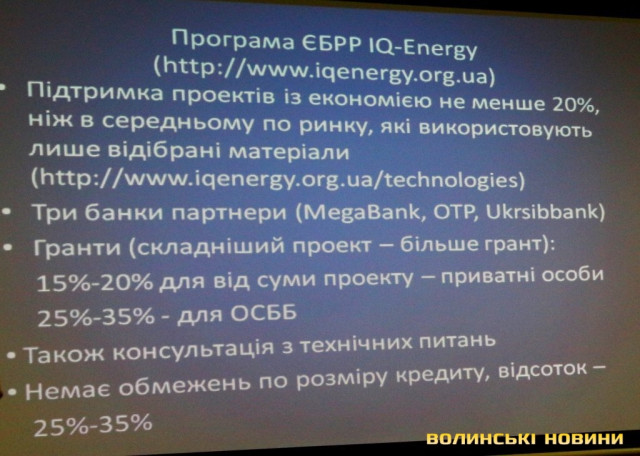 Паралельно Європейський банк реконструкції і розвитку запустив свою програму IQ-Energy. Вона спрямована на ОСББ, передбачає компенсацію від 25 до 35% проекту. Автори програми розробили калькулятор енергоефективності, що допомагає підрахувати витрати на типові проекти, обравши параметри будинку.