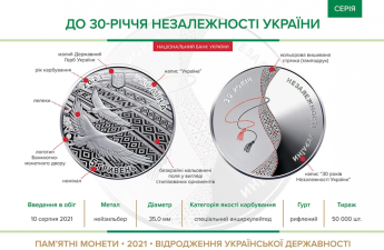 Національний банк з 10 серпня вводить в обіг пам’ятну монету «До 30-річчя незалежності України» номіналом 5 грн