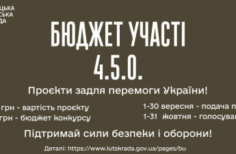 У Луцькій громаді триває голосування за проєкти конкурсу Бюджету участі 4.5.0. Серед проєктів – облаштування укриттів навчальних закладів, проведення козацького наметового таборування, реабілітація ветеранів на заняттях зі стрільби з лука, відкриття класу підготовки операторів дронів і придбання техніки для захисників.