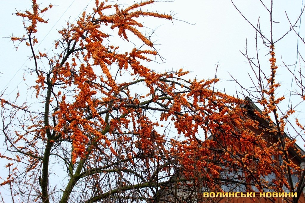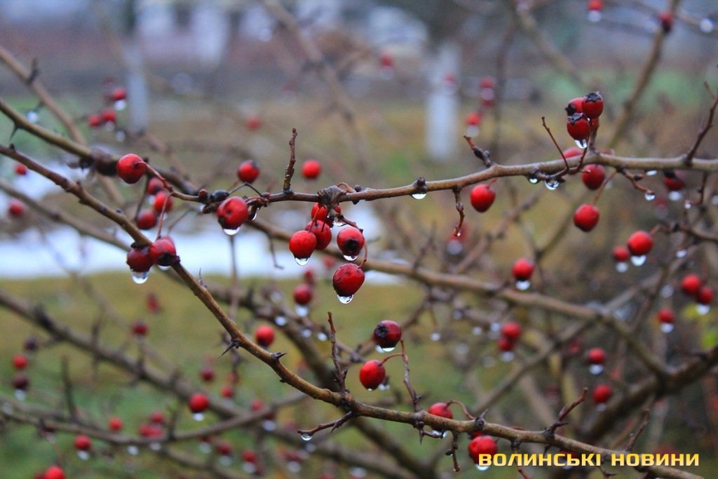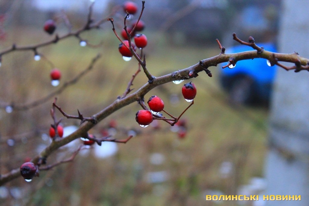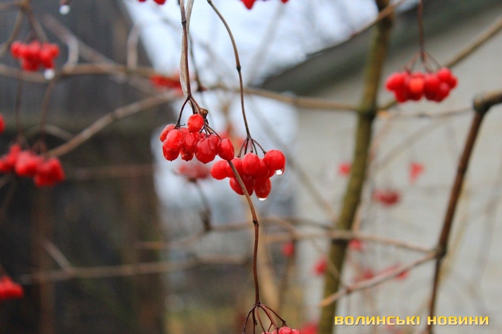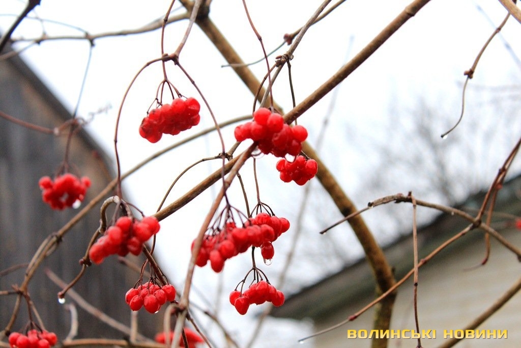 Яскравими плямкам на фоні сірого грудневого дня виділяються червоні ягідки калини та помаранчеві плоди. Усе це матінка-природа дбайливо прикрасила прозорим намистом ранкової роси.