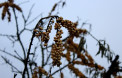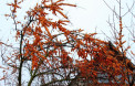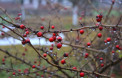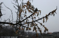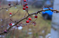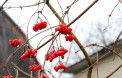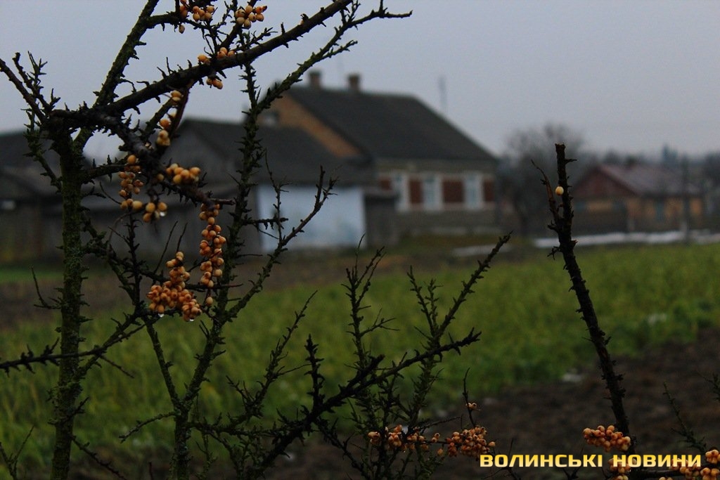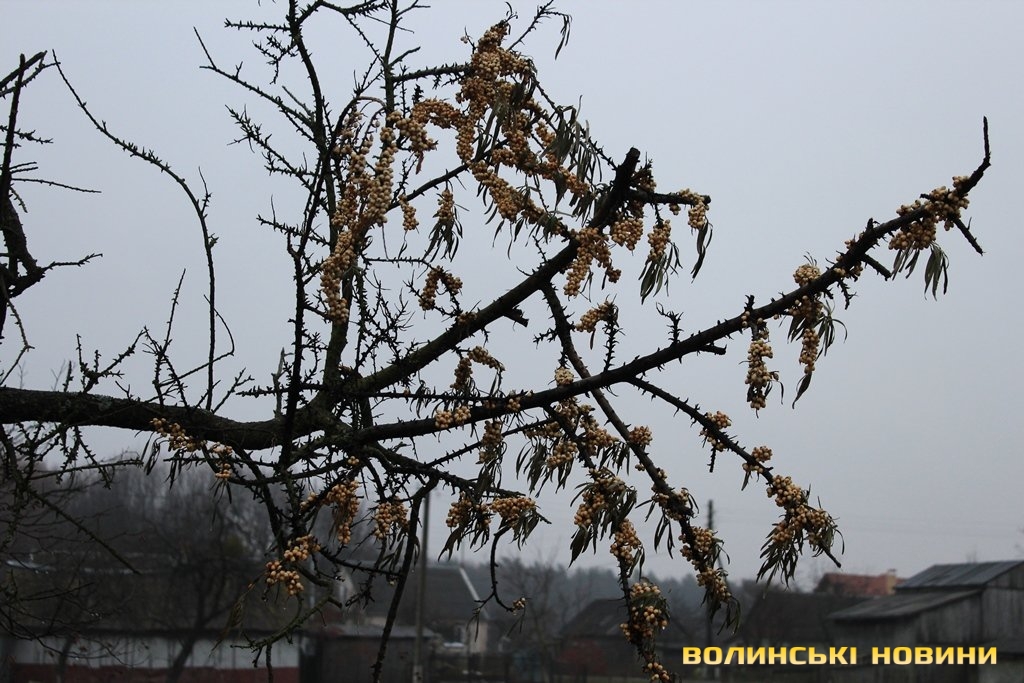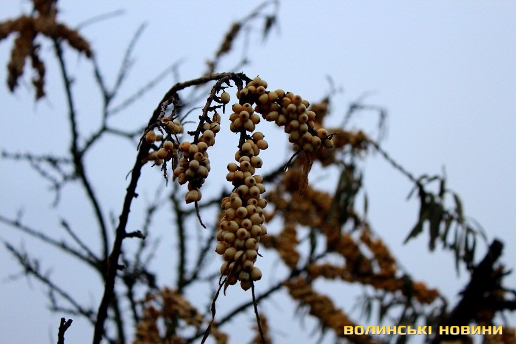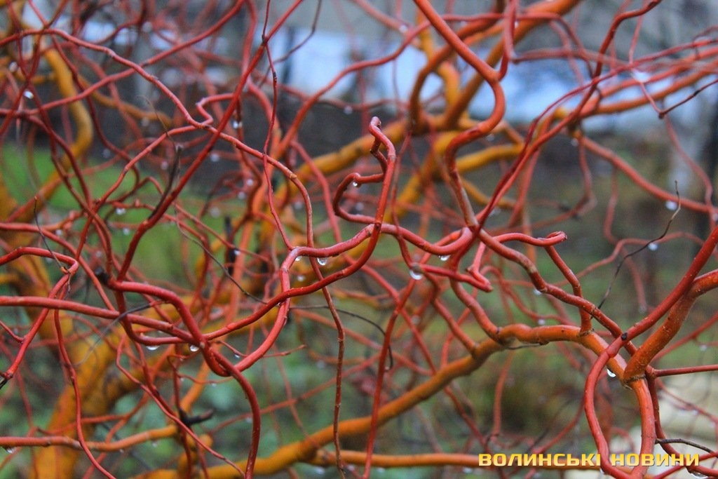 Яскравими плямкам на фоні сірого грудневого дня виділяються червоні ягідки калини та помаранчеві плоди. Усе це матінка-природа дбайливо прикрасила прозорим намистом ранкової роси.