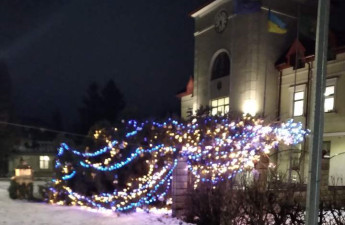 У центрі міста Пустомити, що на Львівщині, від поривів сильного вітру впала міська ялинка.