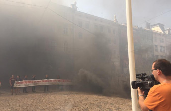 Львівську ратушу затягнула чорна димова завіса. Активісти ГО «Розвиток громади» запалили димові шашки, вимагаючи від міського голови Садового вибачень за образи бійців АТО під час так званого сміттєвого віче.