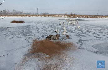 Лебеді на озері Татарка в Іваничах опинились у крижаній пастці