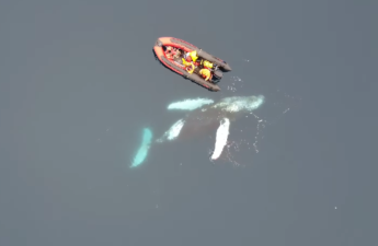 Під час морського виїзду українські вчені-полярники побачили горбатого кита та підійшли поближче, щоб провести дослідження. Зокрема – виміряти його розміри за допомогою дрона, зробити фотоідентифікацію й узяти зразки шкіри та жиру. Поки тривали вимірювання, кит неабияк зацікавився човном і почав плавати під ним та навколо. Така гра тривала близько 15 хвилин.