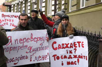 Волинь - №1 за політичними репресіями в Україні, - вважають лучани, які пікетували будівлю прокуратури із перевернутими портретами Віктора Януковича