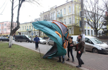 Громадські активісти зводять наметове містечко на вулиці Винниченка навпроти прокуратури у Луцьку, вимагаючи від правоохоронців відпустити політв’язнів