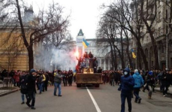 Невідомі на бульдозері штурмують Адміністрацію Президента. Бульдозером розштовхують очеплення із автобусів «Беркуту»