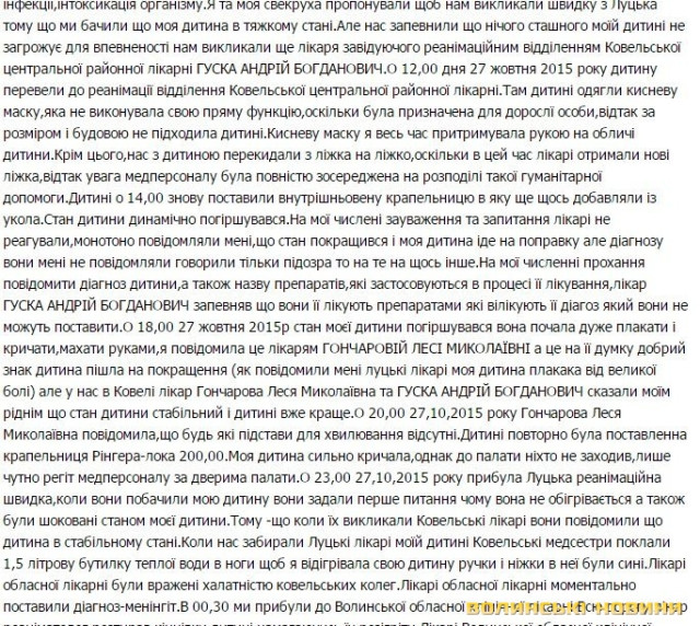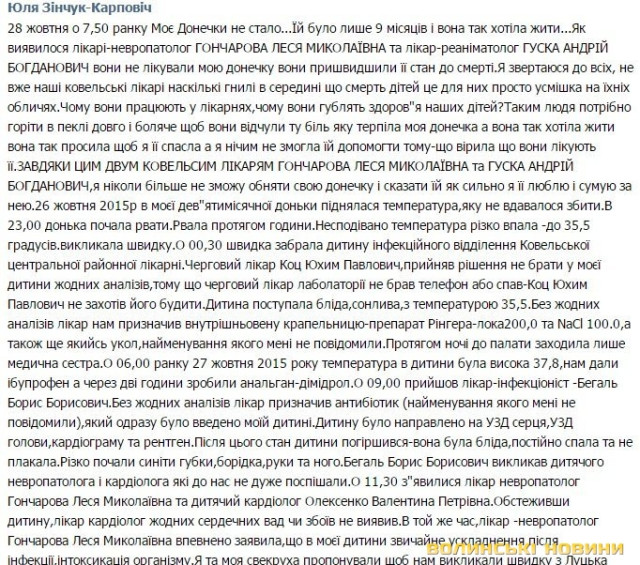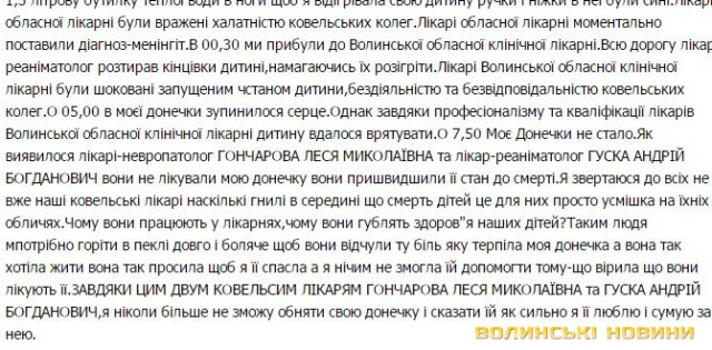 «Коли вони побачили мою дитину, то вони задали перше питання: чому вона не обігрівається, а також були шоковані станом моєї дитини. Тому що, коли їх викликали ковельські лікарі, вони повідомили що дитина в стабільному стані. Коли нас забирали луцькі лікарі, моїй дитині ковельські медсестри поклали 1,5 літрову пляшку теплої води в ноги, щоб я відігрівала свою дитину: ручки і ніжки в неї були сині. Лікарі обласної лікарні були вражені халатністю ковельських колег. Лікарі обласної лікарні моментально поставили діагноз: «менінгіт». В 00.30 год. ми прибули до Волинської обласної клінічної лікарні. Всю дорогу лікар реаніматолог розтирав кінцівки дитині, намагаючись їх розігріти. Лікарі Волинської обласної клінічної лікарні були шоковані запущеним станом дитини, бездіяльністю та безвідповідальністю ковельських колег. О 05:00 в моєї донечки зупинилося серце. Однак завдяки професіоналізму та кваліфікації лікарів Волинської обласної клінічної лікарні дитину вдалося врятувати. Але о 7.50 Моєї Донечки не стало», - пише жінка, яка втратила свою дитину.У тому, що дитину не врятували, батьки дівчинки звинувачують лікарів Ковельської лікарні, стверджуючи що їхня некомпетентність коштувала маленькій дівчинці життя. Зокрема, у смерті донечки, мама звинувачує лікаря-невропатолога та реаніматолога.
