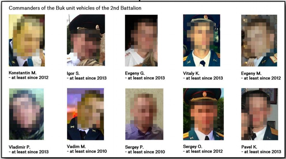 Автори дослідження стверджують, що "Буком", з якого збили літак, швидше за все, управляли військовослужбовці 2-го батальйону 53-ї зенітно-ракетної бригади армії РФ. Bellingcat відзначає, що до складу стандартного екіпажу "Бука" входять двоє осіб - оператор установки і водій, а також двоє офіцерів - сержант і лейтенант. При цьому рішення про запуск ракети ухвалює лейтенант. Автори звіту змогли встановити особи десяти офіцерів 2-го батальйону, один з яких зміг віддати наказ. Утім, хто саме це зробив, експерти Bellingcat у даному звіті не кажуть, тому у ньому вказані лише їхні імена і перші літери прізвищ, а обличчя на фотографіях навмисне розмиті.