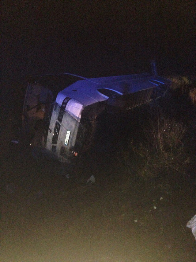 За словами очевидців, автобус стало заносити на повороті і він перекинувся на бік. Удар прийшовся на лобове скло та передню частину автобуса.