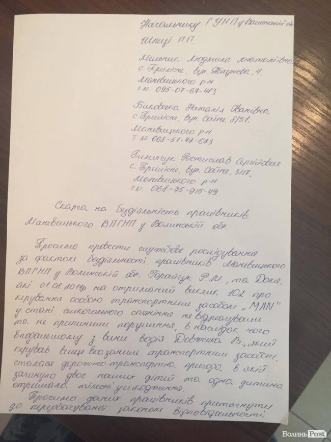 Скаргу на бездіяльність працівників Маневицького ВП ГУНП написали у вівторок, 29 серпня, інформує ВолиньPost.