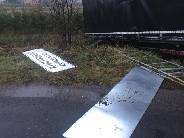 Біля Луцька вантажівка знесла знак та перегородила дорогу. Фото