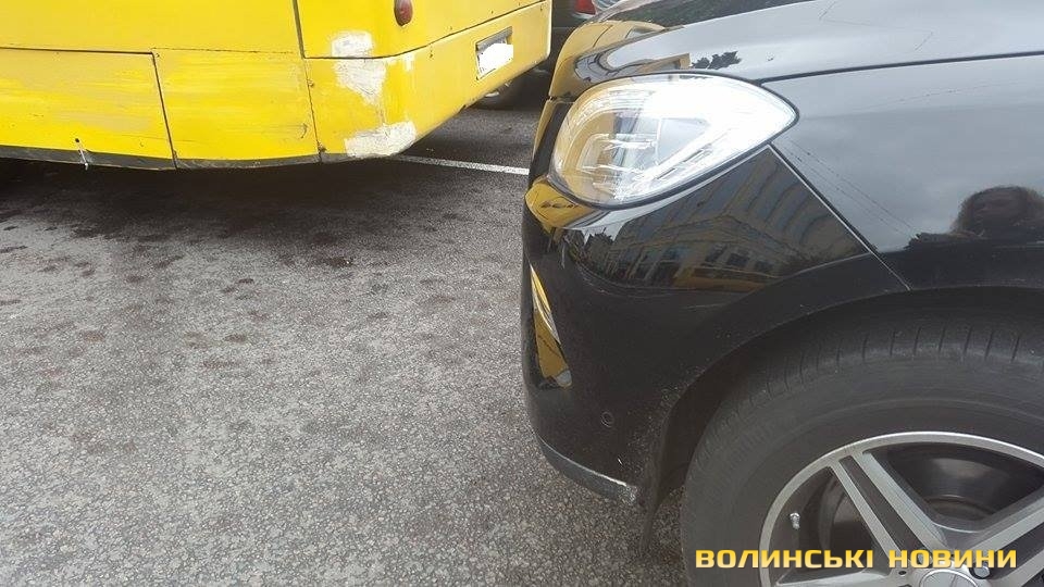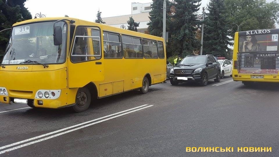 Біля центрального універмагу Луцька трапилася ДТП за участю маршрутки № 31 та позашляховика Mersedes.