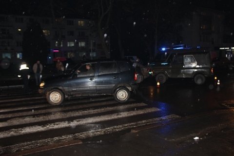 Дуже дивно що іномарка стояла перед переходом, а в неї в'їхав УАЗ. Може, звичайно бути, але більш за все віриться в те що іномарка летіла, а водій УАЗа її не побачив і почав рух, а вже перед переходом зустрілися та й поцілувалися. А вулиці дійсно освітлені класно! Такого чорного світла ще пошукати треба - креативчик!
