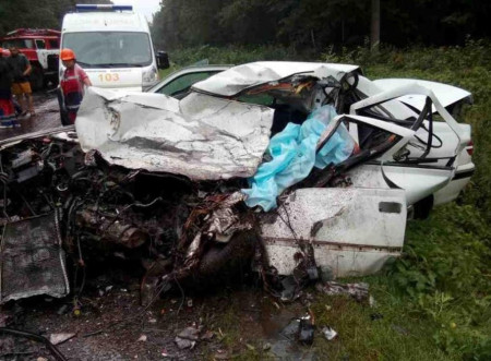 На місці аварії рятувальники розрізали пошкоджений автомобіль та дістали тіло людини.
