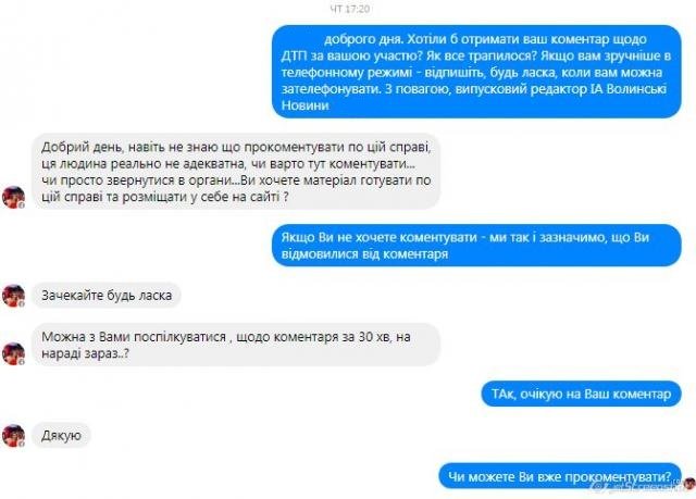Аби вислухати обидві сторони конфлікту, Інформаційне агентство Волинські Новини вчора, 6 липня, звернулися за коментарем до водія Ауді Вікторії Доманської. Однак, на жаль, почути її версію не вдалося.