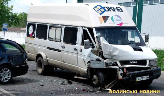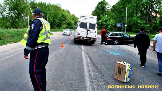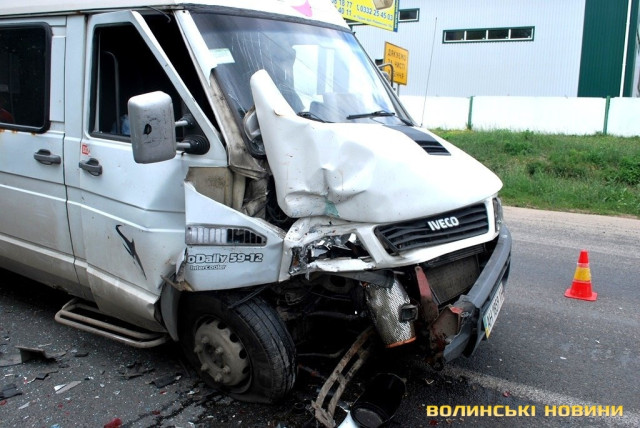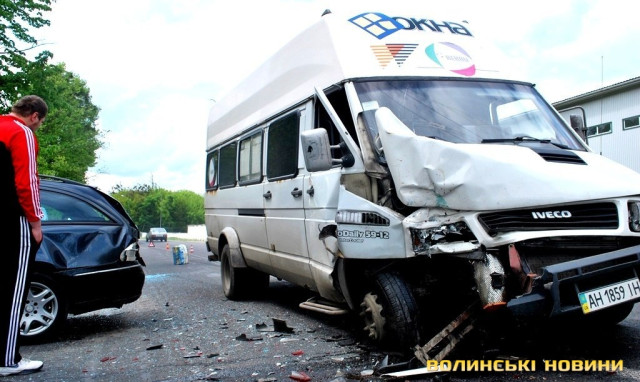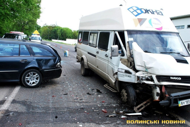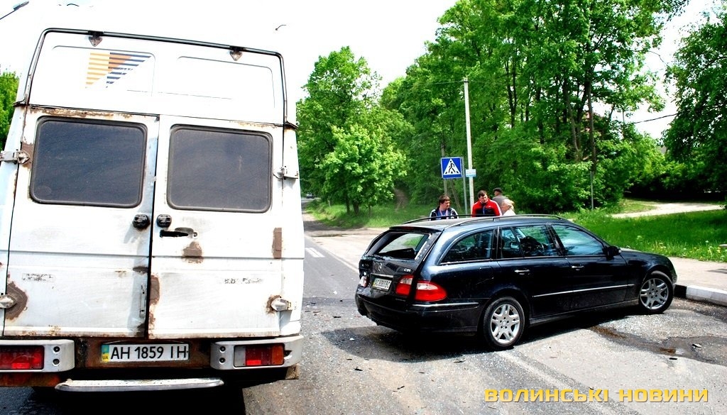 Коли водій «Мерседеса» різко натиснула на гальма, мікроавтобус в’їхав у легковик, якого, як наслідок, розвернуло.
