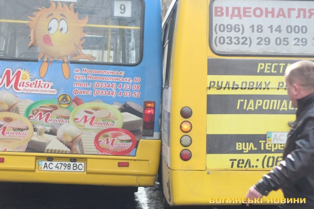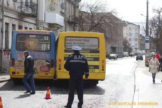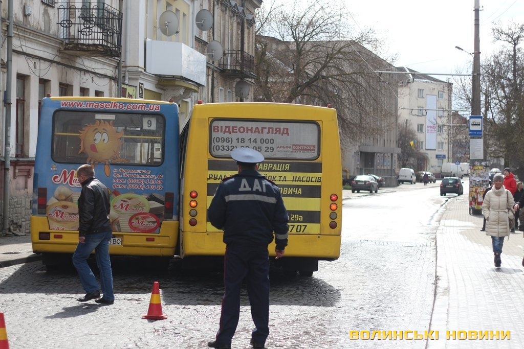 Два автобуси «притерлись» боками поблизу Луцької міської ради. Ніхто з пасажирів не постраждав, а машини відбулися легкими пошкодженнями.