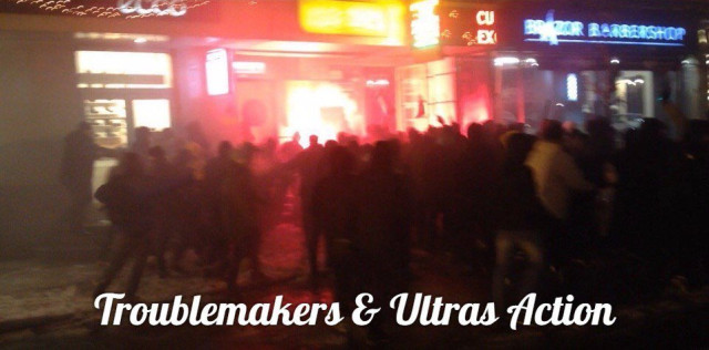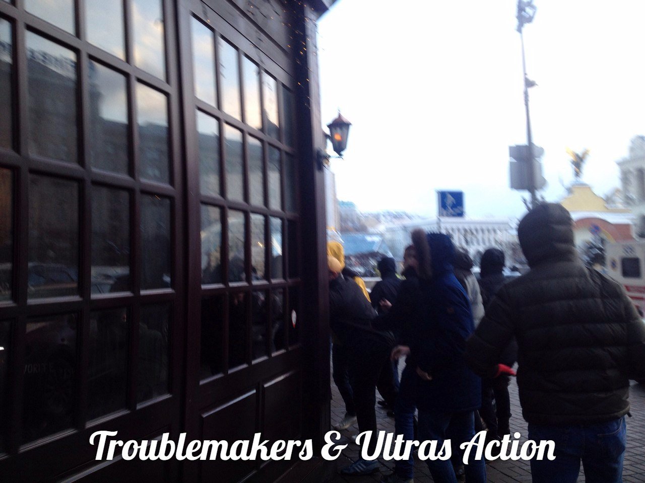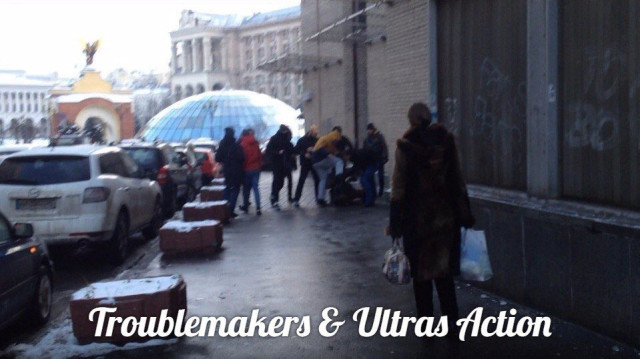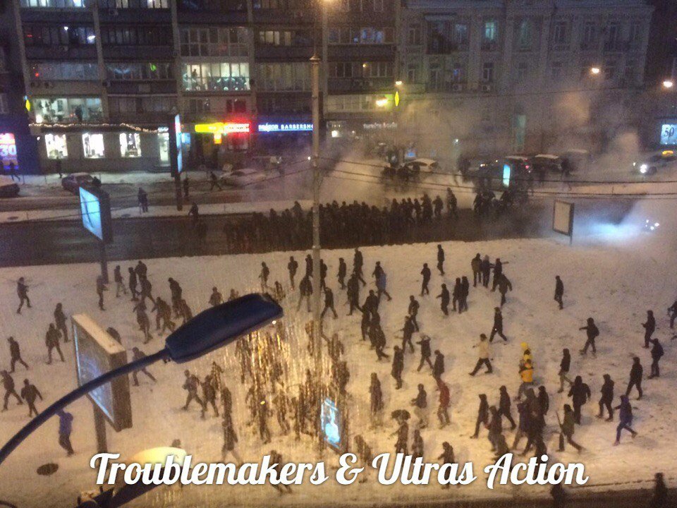 Відповідні фото розміщені на сторінці спільноти Troublemakers & Ultras Action Вконтакті. Повідомляється, що сутички за участі вболівальників також сталися в провулках біля Майдану, - повідомляє Громадське.