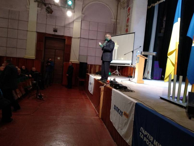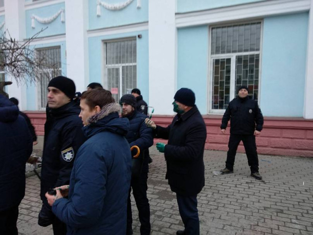 Коли політик з’явився на площі перед БК «Софіт» його облили зеленкою. Політик разом з охороною спробував потрапити в приміщення будинку культури. Між правоохоронцями та активістами відбулась сутичка. Активісти заблокували вхід і кандидат в президенти від Опоблоку потрапити всередину будівлі не зміг.
