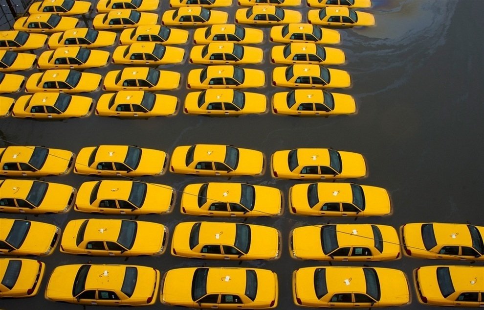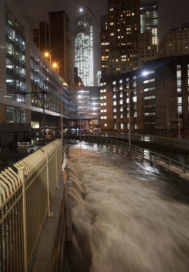 Машини плавають біля затопленого в’їзду на стоянку Фінансового кварталу, Манхеттен, Нью-Йорк, США