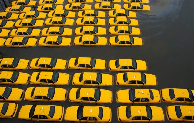 Жовті таксі виглядають із води в Хобокені, штат Нью-Джерсі, США
