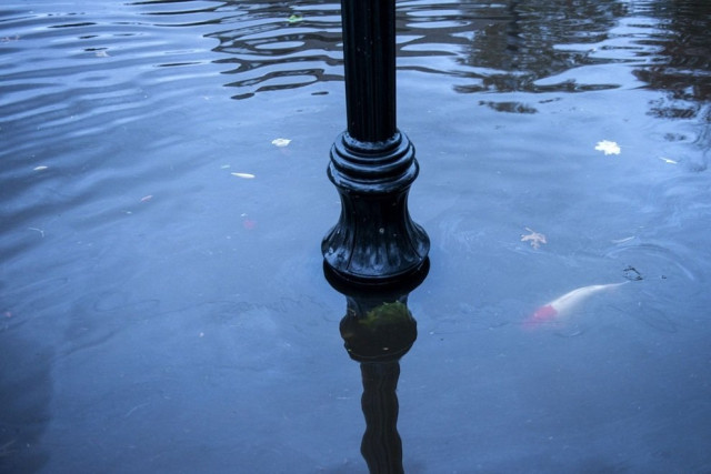 Велика акваріумна риба плаває затопленою Мейн-стрит в Літл-Феррі, штат Нью-Джерсі, США