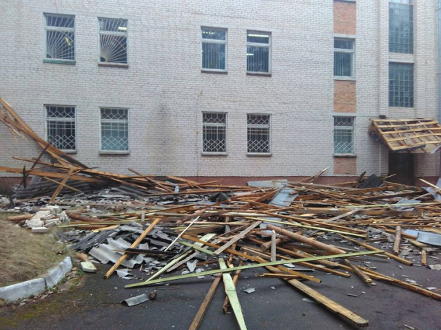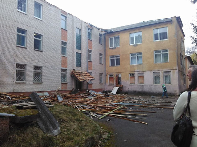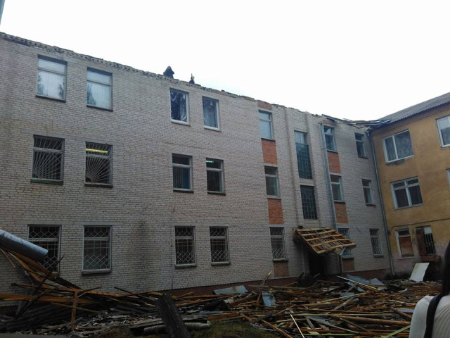 Повністю знесло дах у так званому "перешийку", що сполучає приміщення старої лікарні з новим. Окрім того, вітром обірвало провід, який, вочевидь, і спричинив загоряння покрівлі гаражів фінуправління РДА та страхової кампанії "Оранта".