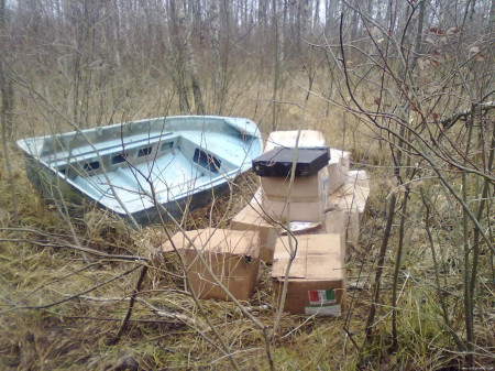 У кущах вартові кордону знайшли 12 ящиків з термоізоляційними матеріалами, 2 ящики з фреоном, а також металевий човен, на якому порушники, найімовірніше, планували переправити товар до Білорусі.