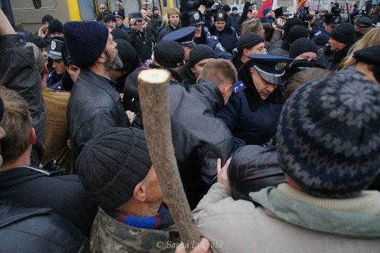 О 14:20 серед пікетувальників пройшла чутка, що зібрання вже закінчилося і його учасники сідають в автобуси. Тоді близько 300 осіб прорвали міліцейський кордон й підбігли до автобусів. Люди кидали каміння, гнилі помідори й мандарини й порозбивали вікна автотранспорту.
