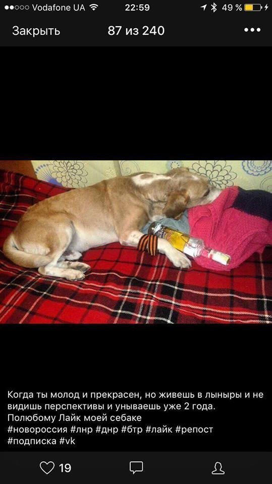 Окрім того, ВолиньPost опублікував фото з мереж, на яких переселенка з Луганська Таропіна позує з символікою «русского міра», так званими ополченцями та навіть на свого собаку причепила георгіївську стрічку.