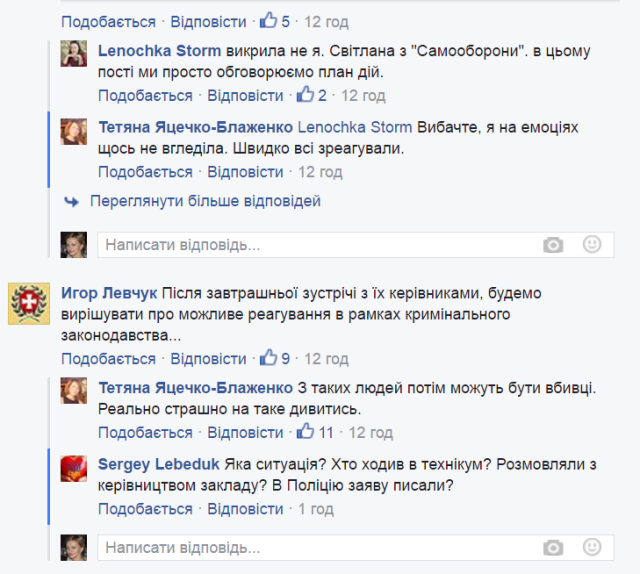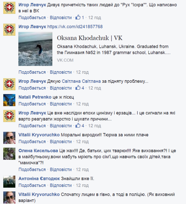 Як ви могли такий "шлак" взяти в свій рух, ви ж позіціонуєте себе патріотами. Розспустіться!!! бо потім всі перейдете в дорослі ГО і такі псевдопатріоти будуть казати іншим що їм робити як жити. На громадські роботи ви її направили. Виключте її з своїх лав, або самі розпустіться. А якщо ви так її вигороджуєте. То може вами краще займеться СБУ та перевірить вашу діяльність, кого ви тримаєте в своїх рядах. От за...бали такі рухи. Окрім двох гасел нічого не знають вища ступінь тупості. Нам таких псевдопатріотів не потрібно і рухів таких. Потім виростають всякі цивільні корпуси які бикують на сесіях місцевих рад, громад, вирішуючи свої бізнесові інтереси та їх хазяїв. А складаються такі ЦО з гопоти, нацистів (з реальними татухами в стилі SS) тітушок, ультрас та криміналітету. І ще кричать Слава Україні. Біомусор в руках олігархів ось ви хто. Не прикривайтесь святими ідеалами до яких вам як до Евересту!!!