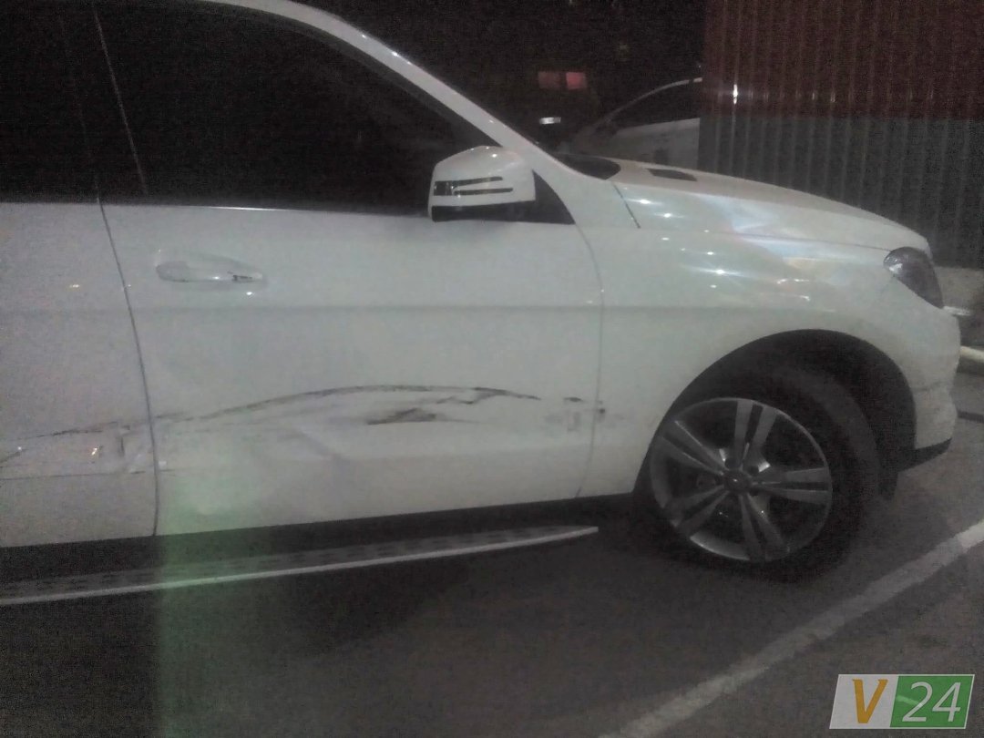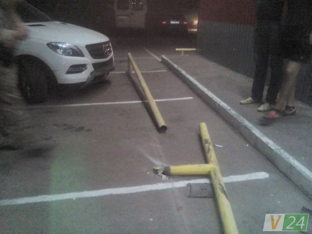 Жінка за кермом автівки «Мерседес» спричинила аварію на автостоянці біля магазину: паркуючись, протаранила огорожу і зачепила сусідній автомобіль «Фольксваген».