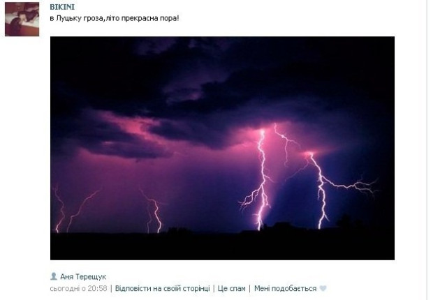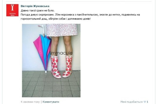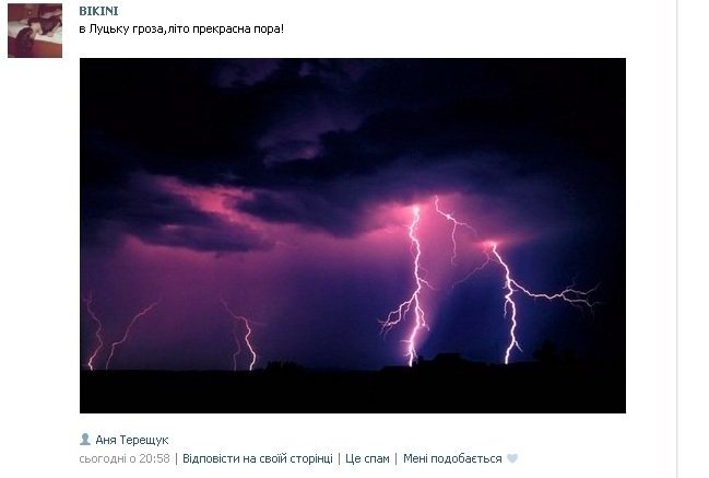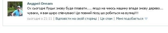 Через кільканадцять хвилин журналіст Анна Єкименко дописала: «На Кравчука біля 21 гімназії повалило дерево і нема проїзду. На розі Кравчука та Воїнів-Інтернаціоналістів, як завше місцеве озеро. Плаває і соборності, біля Гостинця».