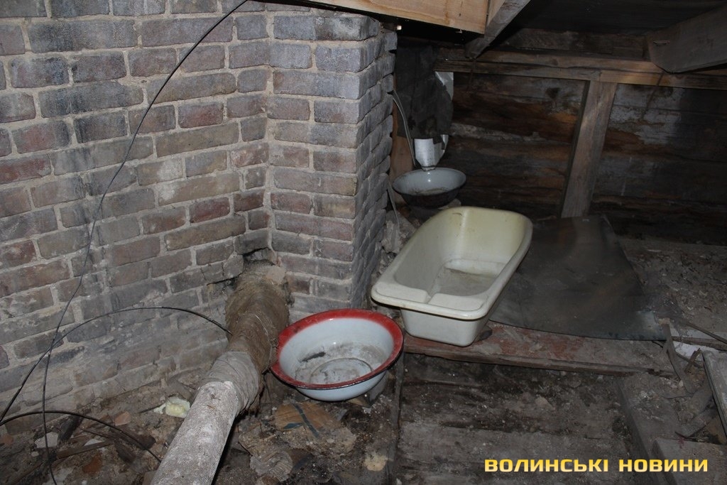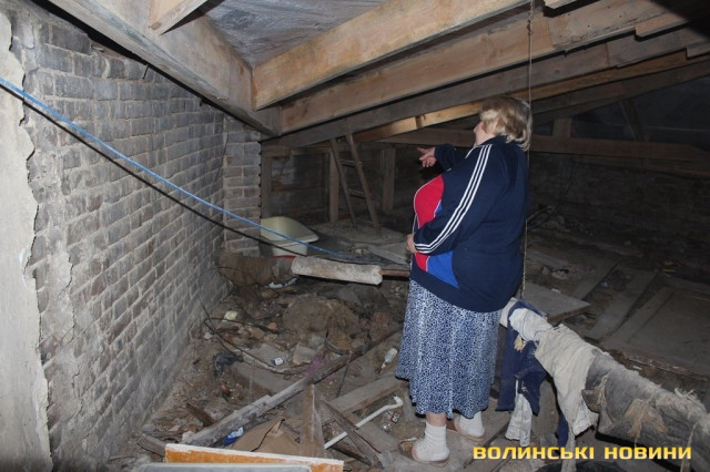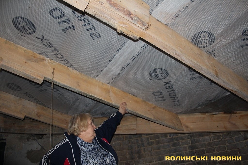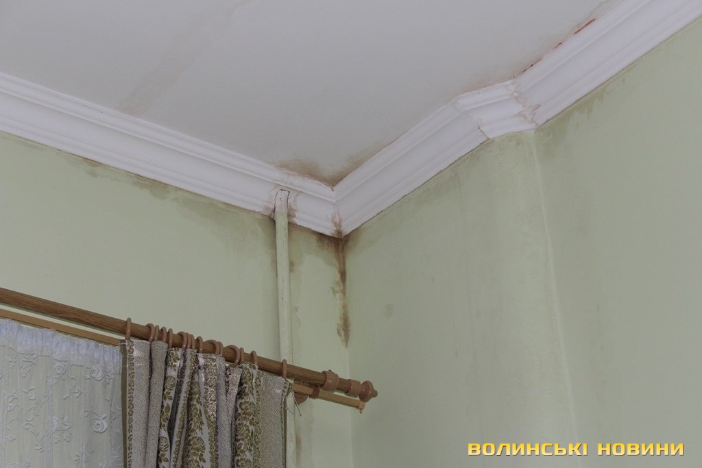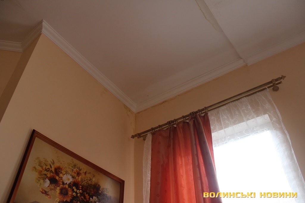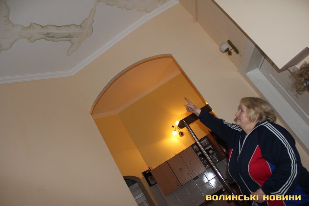 Надія Денисівна більше 30 років живе в Луцьку на вулиці Лесі Українки, 32. Вона каже, що проблеми з дахом були раніше, однак минулої осені зробили капітальний ремонт: стару покрівлю зняли, встановили нову. По цьому, каже пенсіонерка, думали, що проблема вирішена. Втім, пройшло кілька місяців й з першим талим снігом зі стелі потекло: «Он, вчора два відра води винесла – накапало. На даху я поставила відра, миски, щоб мені стеля зовсім не відпала. Вже ремонт зіпсований, по всіх стелях сліди від води, гіпсокартон намок і став зіпсованим, місцями просто відвалюється стеля».Будинок Надії Денисівни є пам’яткою архітектури та містобудування, який збудували на початку 20 століття. Мешканка пригадує, що будівельники дуже халатно ставилися до роботи: «Тут раніше було прибрано, я порядок навела, чистенько. А після ремонту повно сміття лишили, вже 4 мішки винесла, ще досі валяються недопалки, пляшки з під горілки, ще на мішка два назбирається. Ось такі тут були майстри-професіонали й за це їм заплатили 340 тисяч гривень».