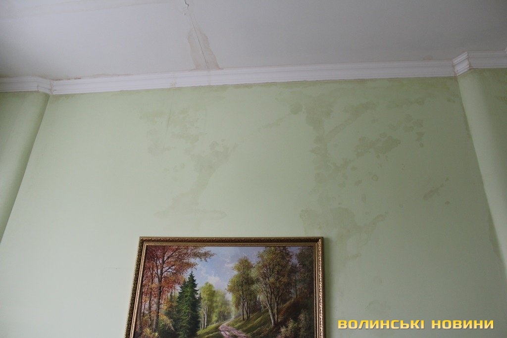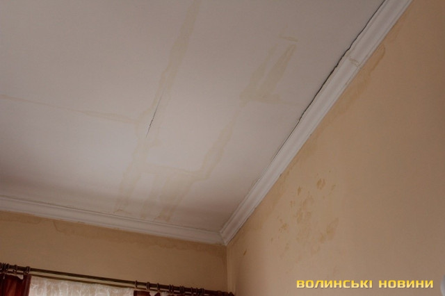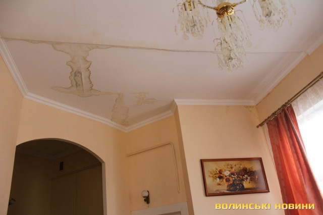 Із фото видно, що вода зруйнувала стелю в кожній кімнаті лучанки.До слова, на пам’ятній табличці на будинку чітко вказано, що житловий будинок охороняється державою і його пошкодження карається законом.